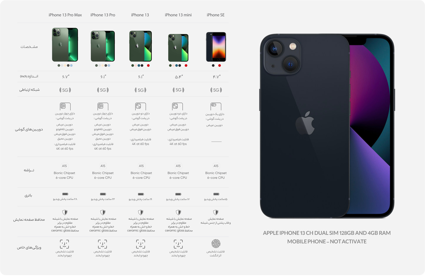 Apple iPhone 13 CH Dual SIM 256GB And 4GB RAM Mobile Phone Not Activateگوشی موبایل iPhone 13 CH پرچمدار جدید شرکت اپل است که با چند ویژگی جدید و دوربین دوگانه روانه بازار شده است. نمایشگر آیفون 13 به پنل Super Retina مجهز شده است تا تصاویر بسیار مطلوبی را به کاربر عرضه کند. این نمایشگر رزولوشن بسیار بالایی دارد؛ بهطوریکه در اندازهی 6.1 اینچیاش، حدود 460 پیکسل را در هر اینچ جا داده است. امکان شارژ بیسیم باتری در این گوشی وجود دارد. تشخیص چهره با استفاده از دوربین جلو دیگر ویژگی است که در آیفون جدید اپل به کار گرفته شده است. از نظر سختافزاری این گوشی از تراشهی جدید A15 بهره میبرد که دارای 15 میلیارد ترانزیستور است که دارای کنترل گرمای مطلوبی بوده که تا بتواند علاوه بر کارهای معمول، از قابلیتهای جدید واقعیت مجازی که اپل این روزها روی آن تمرکز خاصی دارد، پشتیبانی کند. به گفته خود شرکت اپل این گوشی دارای سرعتی 50 برابر نسخه 12 خود است. پردازنده دارای ماژولار جدیدی است که مصرف باتری را بسیار پایینتر آورده است و شما دارای حفظ باتری بالاتری هستید. کیفیت نمایش شما در iPhone 13 دارای 120 هرتز است و کیفیت بالایی را شاهد خواهید بود. اپل در این سری از گوشیهای iPhone خود پردازنده گرافیکیای را قرار داده که از سری 12 گوشیهای خود 30 درصد سریعتر است و این نویدبخش آن است که شما میتوانید بازیهایی را با گرافیک و MAP سنگین تر و بزرگتر اجرا کنید. یکی از ویژگیهایی که در iPhone 13 شاهد هستیم سیستم فیلمبرداری ProRes سینمایی آن است که می تواند انقلابی در فیلمبرداری گوشیهای موبایل بهراه انداخته باشد. گوشیهای نات اکتیو با قرار گرفتن سیمکارتهای داخلی اکتیو میشوند و برخلاف مدل اکتیو پلمپ کالا باز نشده است. گوشیهای اکتیو برند اپل هم به این شکل هستند که به دلیل محدودیتهای برخی از محصولات اپل برای کشور ایران، در کشورهای همسایه بهصورت رسمی با یک بار قرار گرفتن سیمکارت، اکتیو شده و پلمپ میشوند و باید بدانید که این پروسه هیچ مشکلی در راستای گارانتی کالا بههمراه ندارد. پارتنامبرهای اروپا و ژاپن و امارات تک سیمکارت هستند و پارتنامبرهای مربوط به امارات هم از فیس تایم پشتیبانی نمیکنند. پارتنامبر JA (ژاپن) هم حتی در حالت سایلنت صدای شاتر عکس قطع نمیشود.